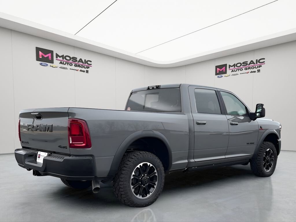 The exterior of this 2026 Ram 2500 commands attention with its bold, rugged styling. The Gray paint complements the aggressive Rebel design, while the power-deployable running boards and MOPAR Spray-in Bedliner ensure both form and function. Equipped with a Sport Performance Hood and 20" Black Diamond Cut Aluminum wheels, this truck is sure to turn heads wherever you go.